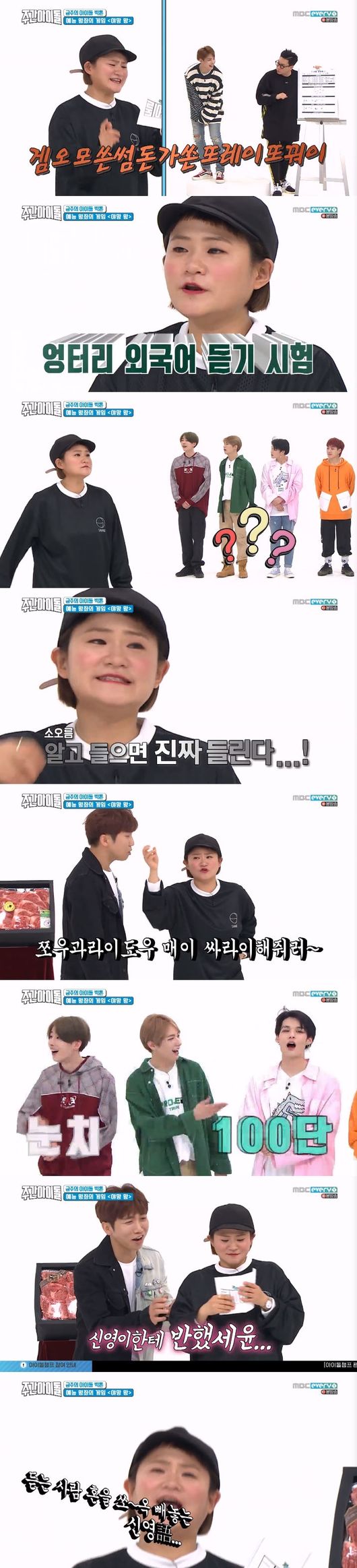 김신영이 제안한 게임은 '엉터리 외국어 듣기 시험'이었다. 이에 김신영은 엉터리 중국어, 태국어로 K팝 노래를 불렀다.