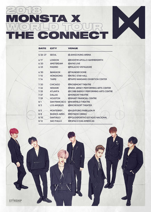 몬스타엑스의 소속사 스타쉽엔터테인먼트는 최근 공식 SNS 채널을 통해 몬스타엑스의 2018 월드 투어포스터를 공개하며 월드 투어의 세부 일정을 알렸다.
