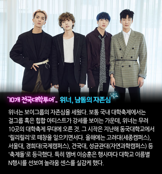 위너는 보이그룹의 자존심을 세웠다. 보통 국내 대학축제에서는 걸그룹 혹은 힙합 아티스트가 강세를 보이는 가운데, 위너는 무려 10곳의 대학축제 무대에 오른 것. 그 시작은 지난해 동국대학교에서 '릴리릴리'로 떼창을 일으키면서다. 올해에는 고려대(세종캠퍼스), 서울대, 경희대(국제캠퍼스), 건국대, 성균관대(자연과학캠퍼스) 등 '축제돌'로 등극했다. 특히 멤버 이승훈은 행사마다 대학교 이름별 N행시를 선보여 놀라움 센스를 실감케 했다.