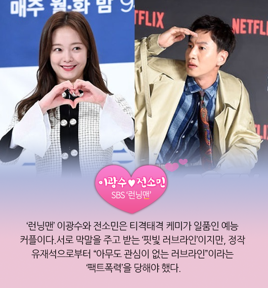 ‘런닝맨’ 이광수와 전소민은 티격태격 케미가 일품인 예능 커플이다. 서로 막말을 주고 받는 ‘핏빛 러브라인’이지만, 정작 유재석으로부터 “아무도 관심이 없는 러브라인”이라는 ‘팩트폭력’을 당해야 했다.