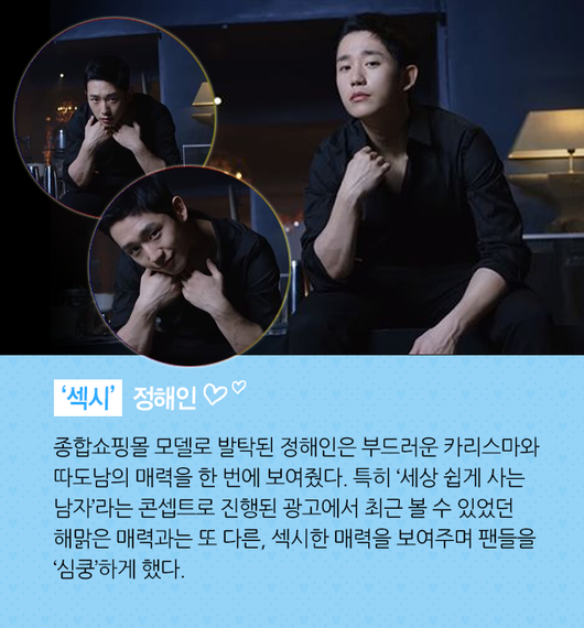 종합쇼핑몰 모델로 발탁된 정해인은 부드러운 카리스마와 따도남의 매력을 한 번에 보여줬다. 특히 ‘세상 쉽게 사는 남자’라는 콘셉트로 진행된 광고에서 최근 볼 수 있었던 해맑은 매력과는 또 다른, 섹시한 매력을 보여주며 팬들을 ‘심쿵’하게 했다.
