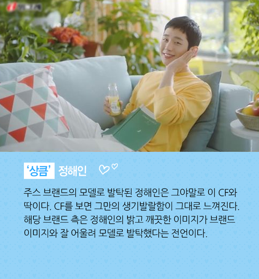 주스 브랜드의 모델로 발탁된 정해인은 그야말로 이 CF와 딱이다. CF를 보면 그만의 생기발랄함이 그대로 느껴진다. 해당 브랜드 측은 정해인의 밝고 깨끗한 이미지가 브랜드 이미지와 잘 어울려 모델로 발탁했다는 전언이다.