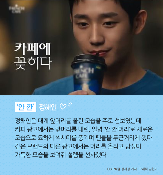 정해인은 대게 앞머리를 올린 모습을 주로 선보였는데 커피 광고에서는 앞머리를 내린, 일명 ‘안 깐 머리’로 새로운 모습으로 묘하게 섹시미를 풍기며 팬들을 두근거리게 했다. 같은 브랜드의 다른 광고에서는 머리를 올리고 남성미 가득한 모습을 보여줘 설렘을 선사했다. /kangsj@osen.co.kr