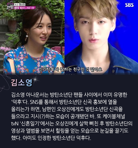 김소영 아나운서는 방탄소년단 팬들 사이에서 이미 유명한 '덕후'다. SNS를 통해서 방탄소년단 신곡 홍보에 열을 올리는가 하면, 남편인 오상진에게도 방탄소년단 신곡을 들으라고 지시(?)하는 모습이 공개됐던 바. 또 케이블채널 tvN '신혼일기'에서는 오상진에게 살짝 삐친 후 방탄소년단의 영상과 앨범을 보면서 힐링을 얻는 모습으로 눈길을 끌기도 했다. 아미도 인정한 방탄소년단 덕후다.