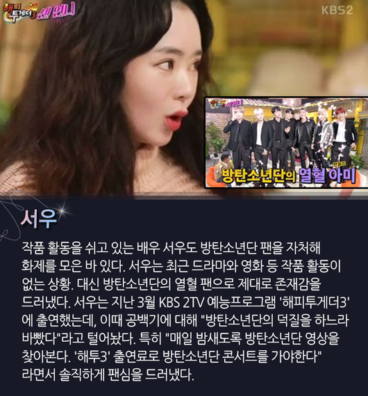 작품 활동을 쉬고 있는 배우 서우도 방탄소년단 팬을 자처해 화제를 모은 바 있다. 서우는 최근 드라마와 영화 등 작품 활동이 없는 상황. 대신 방탄소년단의 열혈 팬으로 제대로 존재감을 드러냈다. 서우는 지난 3월 KBS 2TV 예능프로그램 '해피투게더3'에 출연했는데, 이때 공백기에 대해 "방탄소년단의 덕질을 하느라 바빴다"라고 털어놨다. 특히 "매일 밤새도록 방탄소년단 영상을 찾아본다. '해투3' 출연료로 방탄소년단 콘서트를 가야한다"라면서 솔직하게 팬심을 드러냈다.