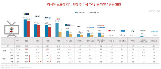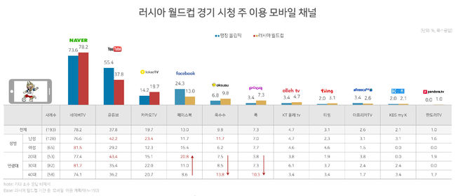 이 보고서에 따르면, 월드컵 경기 시청 및 경기 확인을 위해 모바일(64.0%)을 이용하겠다는 사람들이 가장 많은 것으로 나타났다. 모바일 채널 중에서는 네이버TV를 이용하겠다(78.2%)는 답변이 가장 많았고, 유튜브(37.8%), 카카오TV(19.7%)가 뒤를 이었다. 이에 대해 DMC미디어는 모바일 디바이스 이용 증가, 실시간 경기 중계 및 관련 콘텐츠 제공 채널이 증가하면서 대중의 스포츠 미디어 이용에 모바일이 주요 매체로 자리 잡았다고 평가했다.