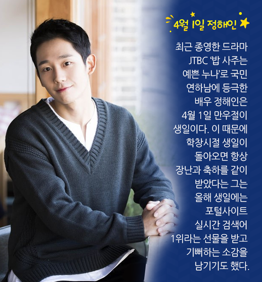 최근 종영한 드라마 JTBC ‘밥 사주는 예쁜 누나’로 국민 연하남에 등극한 배우 정해인은 4월 1일 만우절이 생일이다. 이 때문에 학창시절 생일이 돌아오면 항상 장난과 축하를 같이 받았다는 그는 올해 생일에는 포털사이트 실시간 검색어 1위라는 선물을 받고 기뻐하는 소감을 남기기도 했다.