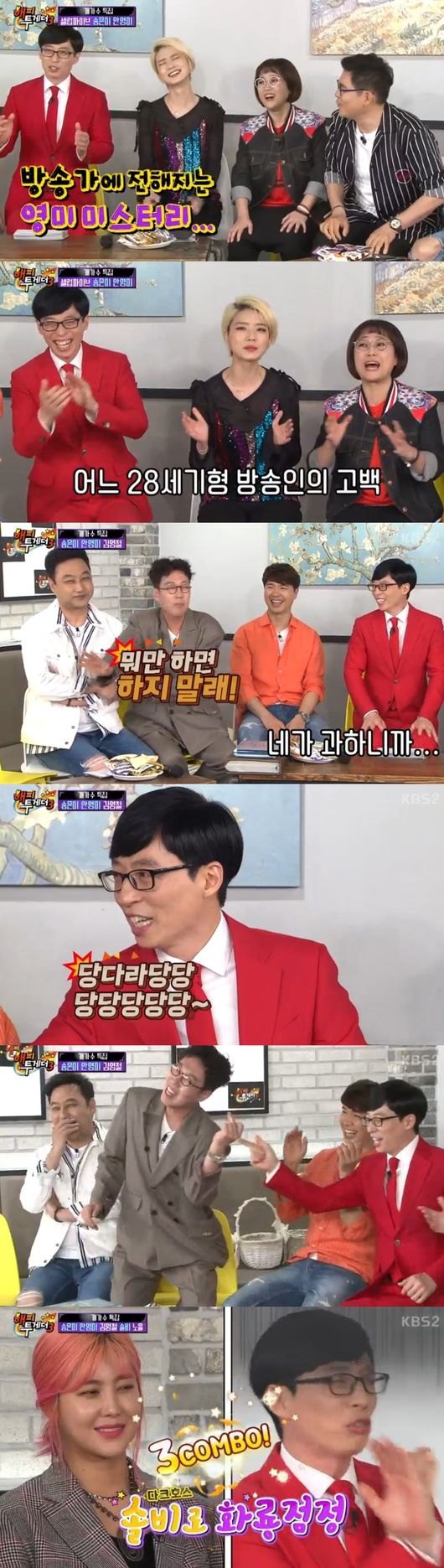 안영미는 "방송 출연을 많이 하는데 다 편집된다. 이제 방송국이 나를 받아들일 때가 됐다"고 19금 행동을 보였다. 유재석은 안영미를 말리며 "왜 이러시냐. 이러니 다 짤리지"라고 말렸다.