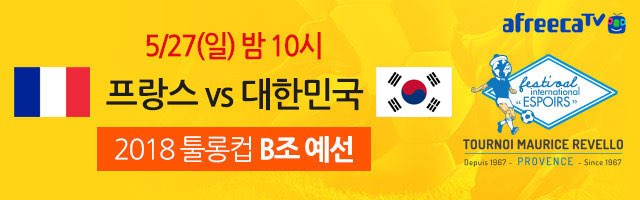아프리카TV에서 2018 툴롱컵 국제대회(Toulon Tournament, 이하 툴롱컵)를 볼 수 있다.
