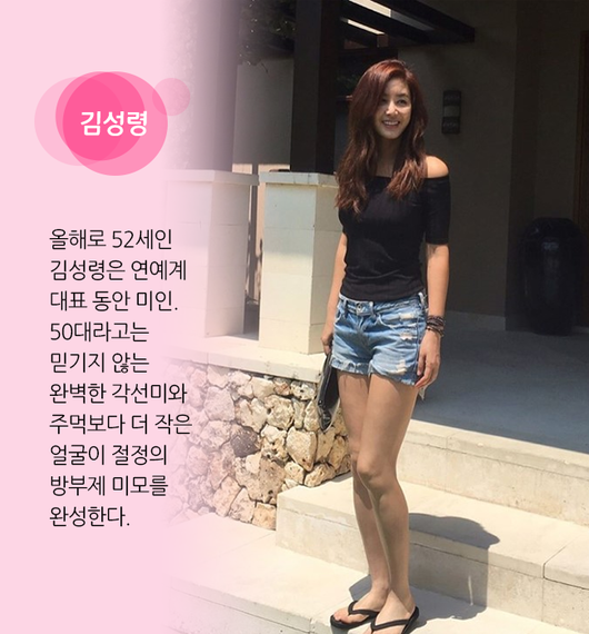 올해로 52세인 김성령은 연예계 대표 동안 미인. 50대라고는 믿기지 않는 완벽한 각선미와 주먹보다 더 작은 얼굴이 절정의 방부제 미모를 완성한다.