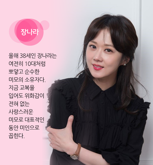 올해 38세인 장나라는 여전히 10대처럼 뽀얗고 순수한 미모의 소유자다. 지금 교복을 입어도 위화감이 전혀 없는 사랑스러운 미모로 대표적인 동안 미인으로 꼽힌다.
