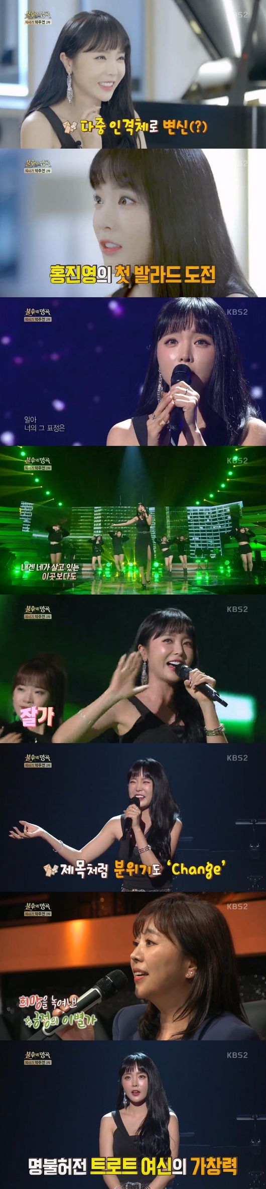 두 번째 순서로 등장한 홍진영은 조장혁의 ‘Change’를 선곡하며 처음으로 발라드에 도전했다. 홍진영은 “정통 발라드를 하는 것은 처음이다. 어깨가 무겁다”며 “이번 무대는 약간 ‘다중이’ 콘셉트다. 웃다가 울다가 하실 것”이라고 각오를 밝혔다.