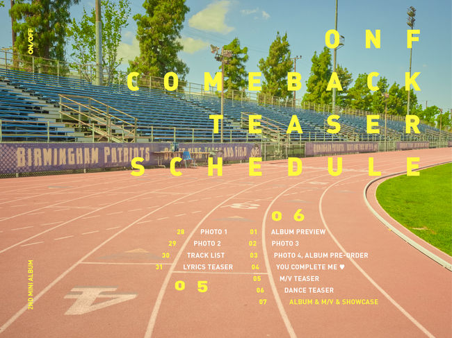 공개된 컴백 스케줄 티저 속에는 청명한 하늘 아래 마치 달려나갈 것만 같은 운동장 트랙이 펼쳐지며 싱그러운 에너지가 솟아난다. 여름에 어울리는 청량한 색감과 함께 이국적인 분위기 속에 온앤오프만의 유니크하면서도 톡톡튀는 감성이 어우러지며 이번 컴백 앨범이 어떠한 음악 색깔로 채워질지 기대를 모은다. 특히 티저 속 스케줄에 ‘YOU COMPLETE ME♡'라는 문구가 적혀 있어서 이것이 어떤 것을 의미하는지 궁금증을 더욱 증폭시키고 있다.