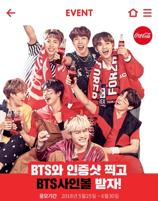 코카콜라는 4년만에 개최되는 2018 국제축구연맹(FIFA) 러시아월드컵에서 소비자들과 함께 월드컵 캠페인 모델 방탄소년단과 함께하는 ‘방탄소년단과 인증샷 찍고 친필 사인볼 받자!’ 이벤트를 진행한다. 대한민국의 골을 기다리며 국가대표팀을 응원하고 월드컵의 모든 순간을 짜릿하게 즐길수 있도록 한다는 기획이다.