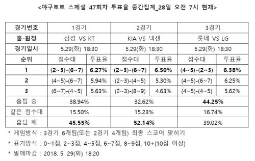 KBO 3경기 대상 야구토토 스페셜 47회차 투표율 중간집계
