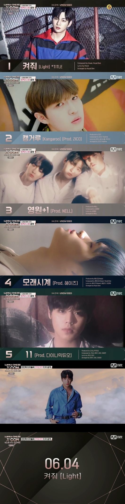 이후 워너원은 내달 4일 공개되는 신보 '1÷x=1(UNDIVIDED)'의 트랙리스트와 타이틀곡 '켜줘'의 뮤직비디오 티저를 최초 공개했다.