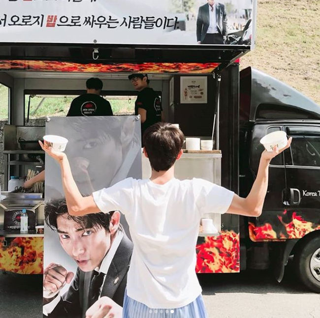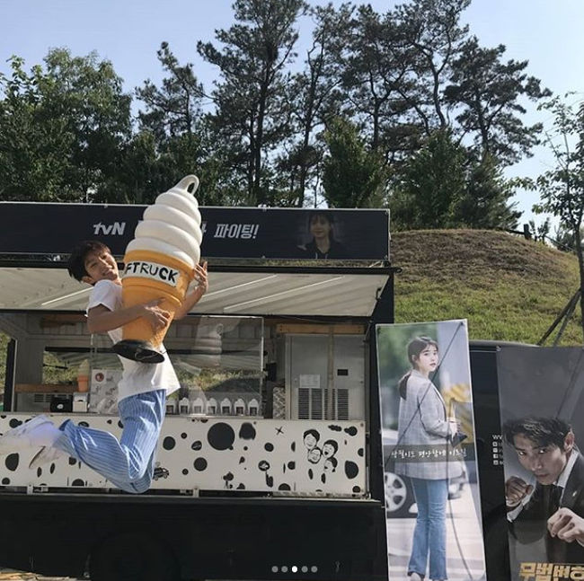 공개된 사진 속 이준기는 아이유가 보내준 간식차 앞에서 포즈를 취하고 있다. '무법변호사 파이팅!', '상필이도 편안함에 이르길' 등의 응원 멘트가 인상적. 이는 tvN '나의 아저씨' 속에 등장했던 대사를 인용한 것으로, 아이유의 센스를 느끼게 한다.