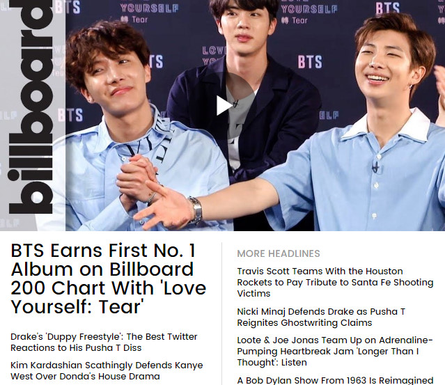 방탄소년단은 지난 18일 발표한 새 앨범 LOVE YOURSELF 轉 'Tear'로 한국 가수 최초로 빌보드 200 차트에서 1위를 따냈다. 빌보드의 메인 차트에서 포스트 말론, 찰리 푸스, 제이 콜, 카르티 비 등 쟁쟁한 팝스타들을 제치고 정상에 올라섰다.