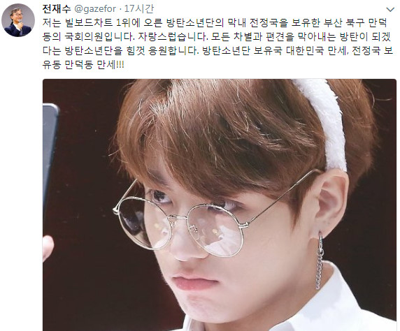 부산 북구강서구갑 더불어민주당 전재수 의원은 방탄소년단 정국의 사진을 트위터에 올리며 "저는 빌보드 차트 1위에 오른 방탄소년단의 막내 전정국을 보유한 부산 북구 만덕동의 국회의원입니다. 자랑스럽습니다. 모든 차별과 편견을 막아내는 방탄이 되겠다는 방탄소년단을 힘껏 응원합니다. 방탄소년단 보유국 대한민국 만세, 전정국 보유동 만덕동 만세"라고 감격했다.