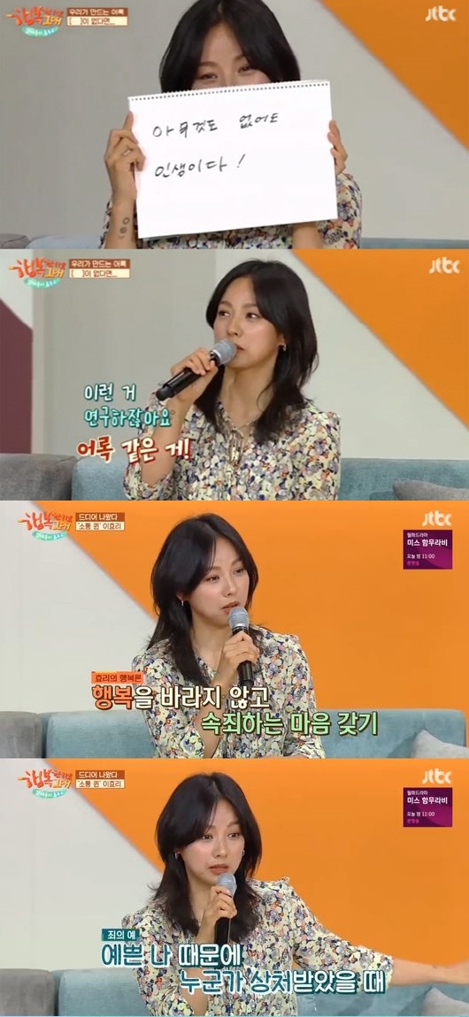 이효리는 자신의 '행복론'에 대해서도 솔직한 생각을 밝혔다. 행복해야 한다는 생각 버리기, 알게 모르게 죄를 짓기에 속죄하는 마음으로 살기 등을 언급했다. 모두에게 마음을 줄 수 없는 자신의 상황이 누군가에게 죄가 될 수 있다는 발언도 이어졌다.