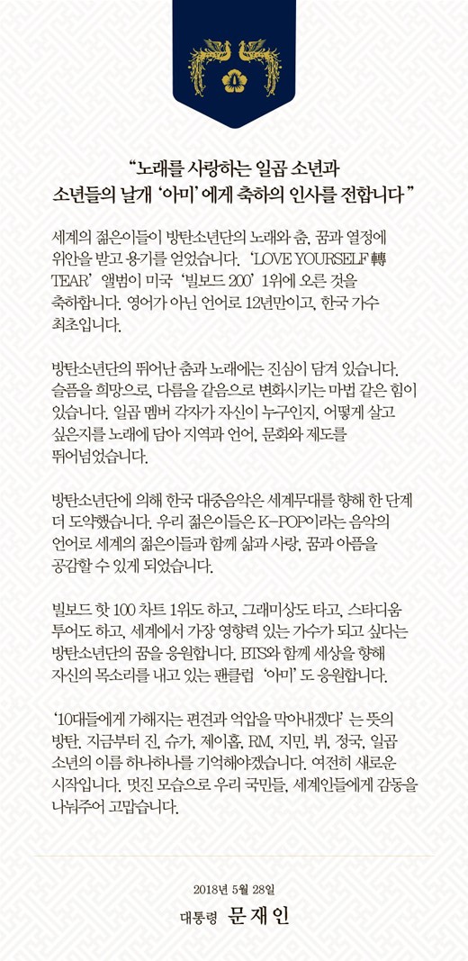 국내에서도 이들의 기세는 여전하다. 문재인 대통령은 방탄소년단에게 축전을 보내며 "방탄소년단에 의해 한국 대중음악은 세계무대를 향해 한 단계 더 도약했다. 우리 젊은이들의 K-POP이라는 음악의 언어로 세계의 젊은이들과 함께 삶과 사랑, 꿈과 아픔을 공감할 수 있게 됐다"며 "세계에서 가장 영향력 있는 가수가 되고 싶다는 방탄소년단의 꿈을 응원한다"고 격려했다. /jeewonjeong@osen.co.kr