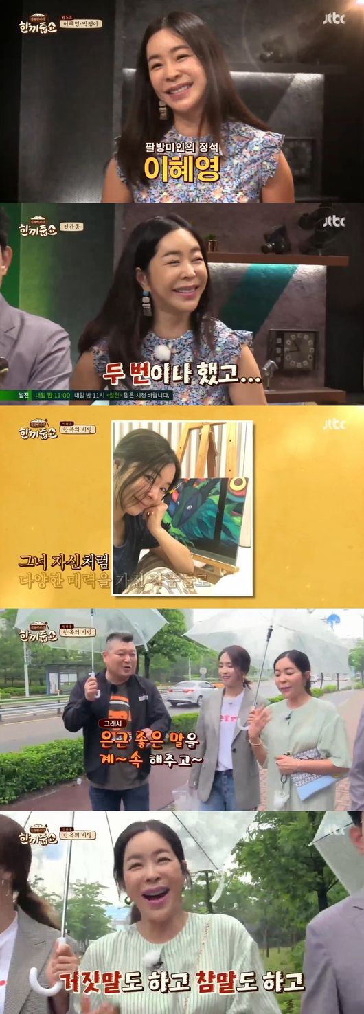 이에 이혜영은 “(이효진은)여자가 봐도 정말 예뻤다. 제가 (강호동에 대한)거짓말도 하고 참말도 하고 오버를 했다(웃음). 성사되게 하려고”라고 당시를 회상했다. 그러면서 “두 분이 결혼해서 잘 사시는데 어느 날 레스토랑에서 우연히 만났다. 너무 화목해 보였다. 당시 내가 두 번째 결혼 전이었는데, ‘나도 빨리 가정을 꾸리고 잘 살아봐야 겠다’는 생각을 했다”고 솔직하게 털어놨다.