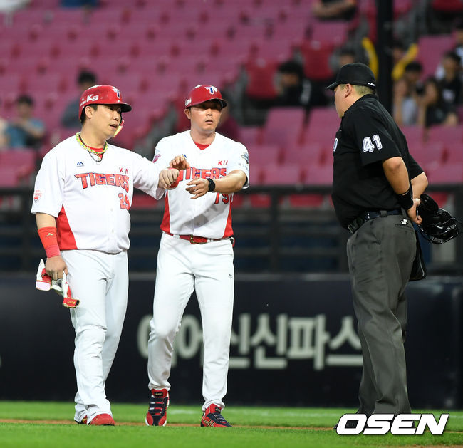 나지완은 4회말 무사 1,2루에서 타석에 들어서 넥센 최원태와 승부를 벌였다. 최원태의 몸쪽 볼에 왼쪽 손날을 맞는듯 했고 배병두 주심이 사구 판정을 내렸다. 곧바로 넥센 벤치에서 방망이 손잡이를 맞은 것 같다면서 비디오판독을 요청했다.