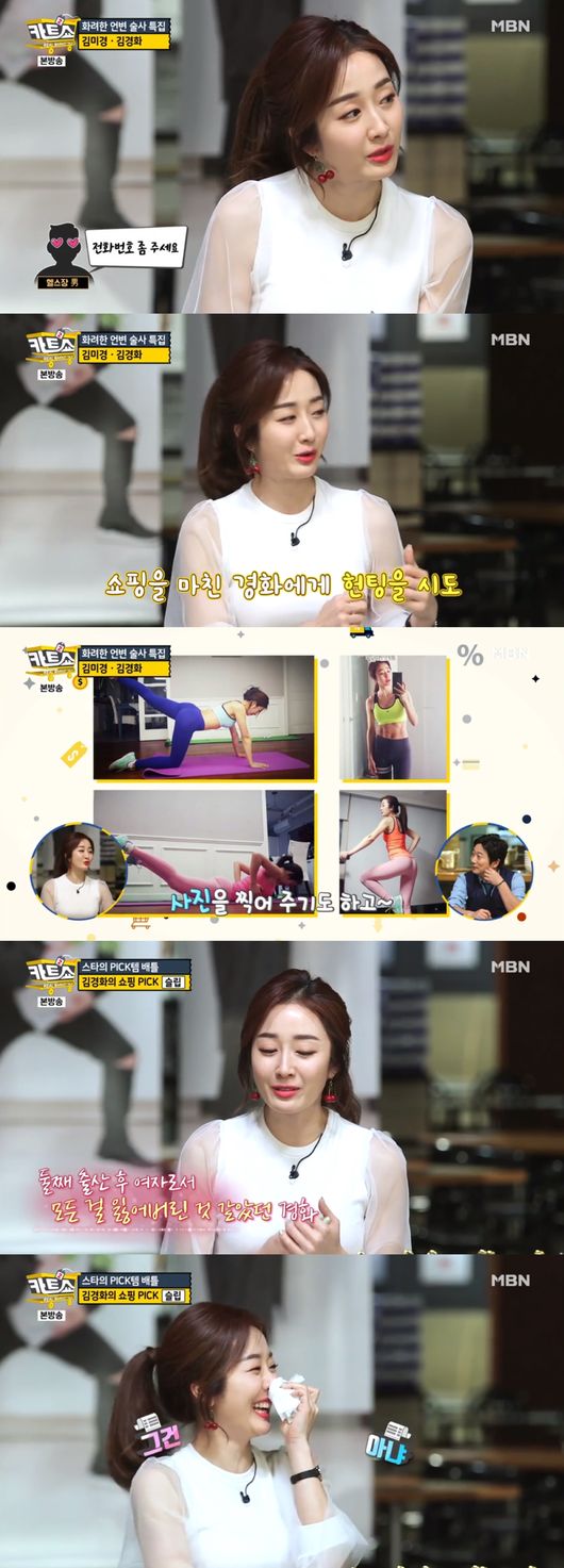 이날 방송에서 김경화는 집에서 운동하는 사진을 공개해 출연진을 깜짝 놀라게 했다. 김경화는 철저한 자기관리로 복근까지 있었다.