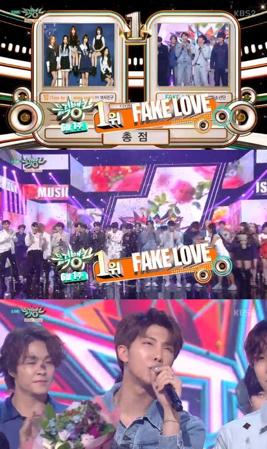 1일 방송된 KBS2 음악방송 '뮤직뱅크'에서는 방탄소년단의 신곡 'FAKE LOVE'와 여자친구의 '밤'이 1위 후보에 올랐다.