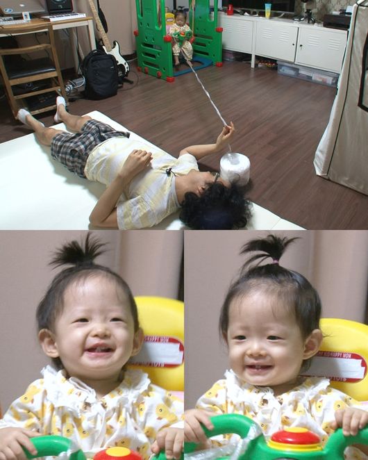 이날 조정치-조은 부녀는 눕방을 펼쳤다. 피곤해 하던 조정치 아빠가 비장의 무기를 꺼냈다고. 바로 노끈이었다. 조정치 아빠는 은이를 그네에 태우고 끈을 그네에 연결했다고 한다. 이어 조정치 아빠는 끈의 반대쪽을 잡고 눕방을 시작했다. 바닥에 누워 물미역이 된 조정치 아빠의 모습은 모두에게 큰 웃음을 선사했다고.