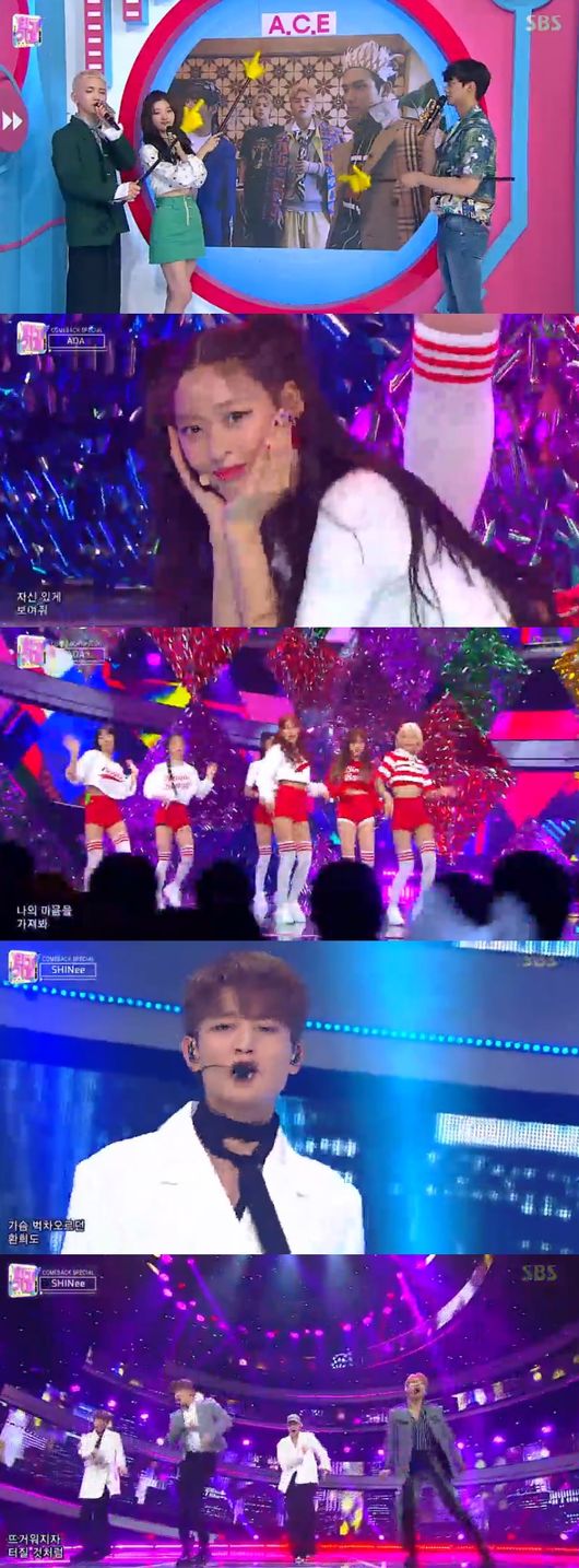 또한 ‘인기가요’는 샤이니를 비롯해 AOA, 프리스틴V, 사무엘이 화려한 컴백무대를 펼쳤다. 먼저, 1년 8개월만에 팬들 곁으로 돌아온 샤이니는 ‘All Day All Night’ ‘데리러 가’ 두 곡의 컴백 무대를 선보였다.
