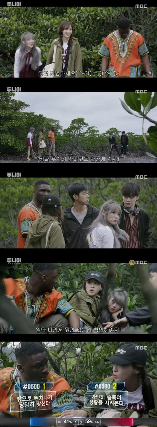 샘 오취리와 정혜성, 유노윤호와 권현빈은 서로를 만나고 동맹을 결성했다. 정혜성은 샘 오취리를 보고 "거의 무쓸모다. 버리고 싶다"며 도망치려 했으나, 샘 오취리가 힘이 세다는 걸 깨닫고 동맹을 결성했다. 유노윤호와 권현빈은 첫 만남부터 서로에게 호감을 드러내며 브로맨스 케미를 만들었다. 마지막 막내 루다까지 만나며 다섯 명은 두니아에서 마침내 모두 만나게 됐다.