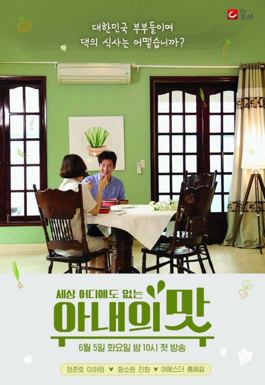 그런가 하면 ‘세상 어디에도 없는, 아내의 맛’은 정준호, 이하정 부부의 다정함이 묻어나는 메인포스터를 첫 공개했다. 파릇파릇 초록색 벽지가 싱그러움을 돋우는 가운데, 따스한 조명을 배경으로 클래식한 디자인의 식탁에 나란히 앉아 웃음을 터트리는 정준호와 이하정의 모습이 담긴 것. ‘행복함’이 묻어나는 두 사람의 식사 장면과 함께 “대한민국 부부들이여 댁의 식사는 어떻습니까?”라는 문구가 내걸리면서 대한민국을 대표하는 셀럽 부부들의 리얼한 주방이야기에 대한 기대감을 증폭시키고 있다.