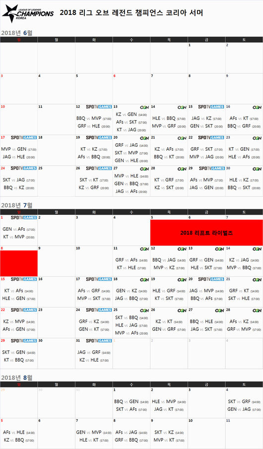 이번 서머스플릿 기간 중 6월과 7월에는기존 주 5회 진행되던 LCK 정규 리그가주 6회(화, 수, 목, 금, 토, 일요일) 오후 5시와 8시에 경기가 진행된다. 이는 LoL이 인도네시아 자카르타 및 팔렘방에서펼쳐지는 2018 아시안게임의 시범 종목으로 선정되면서,한국 대표팀이 8월 말부터 9월 초까지 열리는 아시안게임 본선에 참가할 수 있도록 경기 일정이 조정됐기 때문이다. 사상 최초로 e스포츠가 아시안게임 시범 종목으로 채택돼 태극 마크를 달고 국가를 대표해 나서는 만큼, 프로팀들과 선수, 방송사 등이 적극적으로 협조해 조율이 가능했다.
