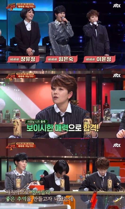 이날 방송에서 쎄쎄쎄는 '신데렐라 컴플렉스(온달에게 고함)', '아미가르 레스토랑', '떠날거야' 등으로 90년대 큰 인기를 끌었던 그룹이자 원조 걸크러시 매력을 뽐냈다. 임은숙은 장유정, 이윤정과 함께 '슈가맨2'에 등장해 오랜만에 시청자들에게 반가움을 선사했다./hsjssu@osen.co.kr