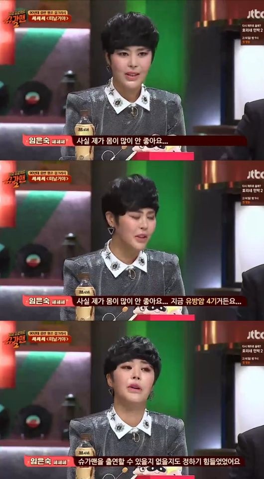 과거 그룹 쎄쎄쎄로 활동한 고인은 지난 1월 29일 방송된 JTBC '슈가맨2'에 출연해 암 투병 사실을 고백했다. 당시 임은숙은 "유방암 4기다. 지난달에 간 전이가 돼 여기 나올 수 있을지 없을지도 모르는 상황이었다. 하지만 딸과의 약속을 지키기 위해 나왔다. 병을 앓고 계시는 모든 분들 힘 내셨으면 좋겠다"고 털어놨다.