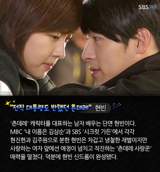 '츤데레' 캐릭터를 대표하는 남자 배우는 단연 현빈이다. MBC '내 이름은 김삼순'과 SBS '시크릿 가든'에서 각각 현진헌과 김주원으로 분한 현빈은 차갑고 냉철한 재벌이지만 사랑하는 여자 앞에선 애정이 넘치고 직진하는 '츤데레 사랑꾼' 매력을 떨쳤다. 덕분에 현빈 신드롬이 완성됐다.
