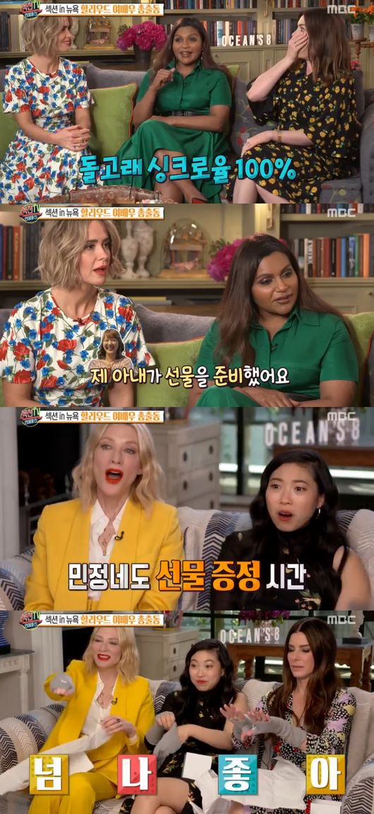 특히 안성훈과 서민정은 준비한 선물을 전했고, 할리우드 배우들은 감동했다. 답례로 친필사인 포스터를 선물하자, 서민성은 "우리 집 거실에 걸어두겠다"며 기뻐했다. 감독 게리로스 인터뷰도 이어졌다. 흥행 성공을 예감하며 '오션스9'도 계획하고 있냐고 묻자, 그는 가능성을 열어놔 눈길을 끌엇다.