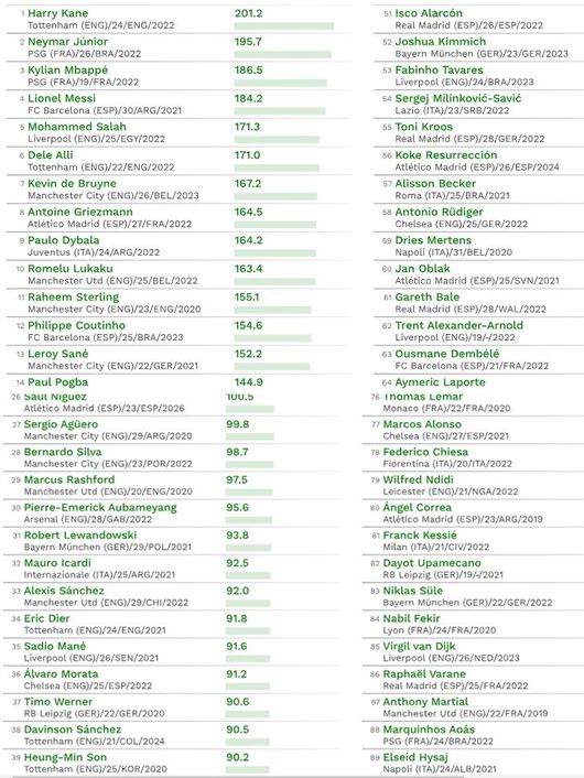 손흥민의 팀 동료인 해리 케인이 2억 120만 유로(약 2518억 원)로 1위를 차지한 가운데 네이마르(1억 9570만 유로), 킬리안 음바페(1억 8650만 유로), 리오넬 메시(1억 8420만 유로), 모하메드 살라(1억 7130만 유로)가 차례로 뒤를 이었다.