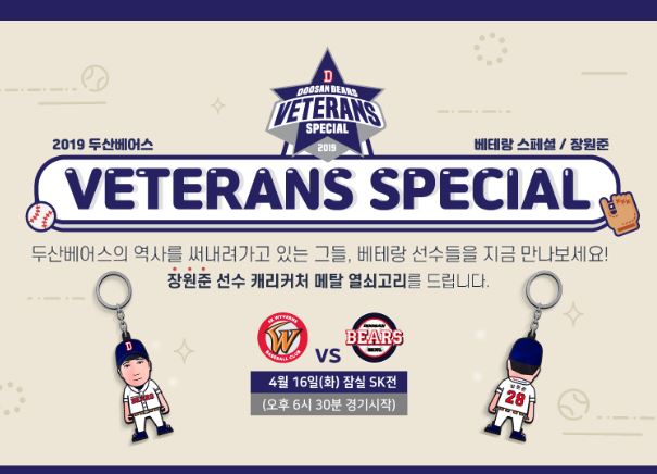 '베테랑 스페셜' 주인공은 장원준이다. 두산은 이날 레드석 102, 202블럭을 '스페셜 A존', 레드석 101, 201 블럭을 '스페셜 B존'으로 편성해 이 좌석을 예매한 팬들에게 장원준 캐리커처 메탈 열쇠고리를 선물한다.