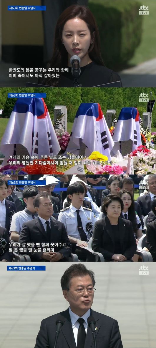 한지민은 추모헌시 ‘우리 모두 초록빛 평화가 되게 하소서’를 차분한 목소리로 낭독하며 나라를 위해 희생한 사람들을 추모했다.