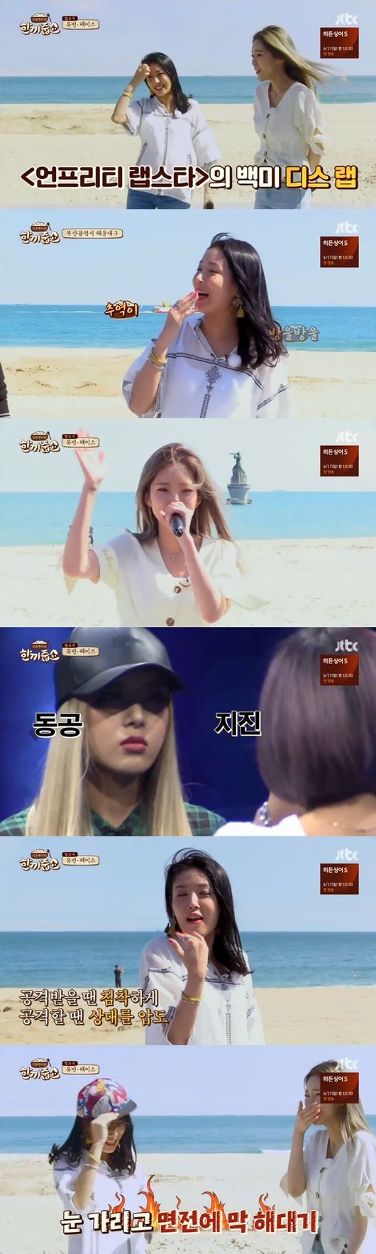 유빈은 '언프리티 랩스타'와 디스전에 대한 질문이 나오자 "약간 멘붕이 온다. 나에 대한 디스를 들으면. 그래서 막 눈동자도 흔들린다"라며 "그걸 어떻게 감추느냐가 중요하다. 모자로 눈을 가려야 한다"라고 노하우를 설명해주기도 했다. 헤이즈도 디스전 당시에 대해 떠올렸다. 이제야 말할 수 있는 비하인드였다.