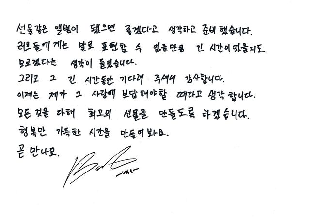 백호는 자필편지를 통해 "러브(팬클럽명)들에게는 말로 표현할 수 없을만큼 긴 시간이었을지도 모르겠다는 생각이 들었다. 그 긴 시간동안 기다려주셔서 감사하다. 이제는 내가 그 사랑에 보답해야 할 때"라고 밝히며 에둘러 공백기 당시 팬들을 향한 마음을 전했다.