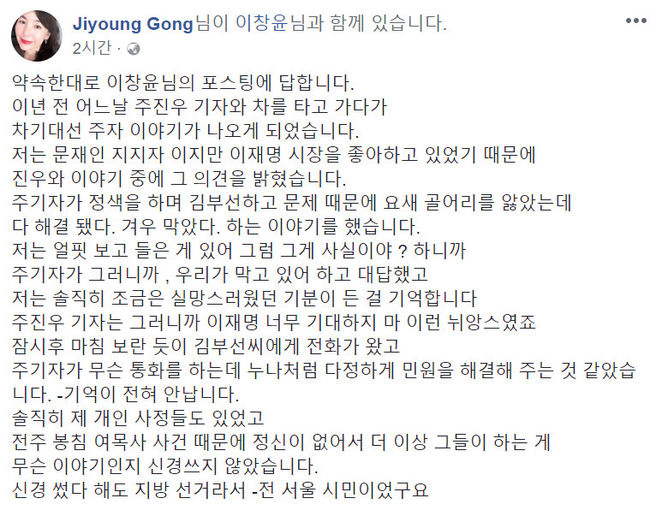공지영은 7일 자신의 SNS에 "이년 전 어느날 주진우 기자와 차를 타고 가다가 차기대선 주자 이야기가 나오게 되었습니다. 저는 문재인 지지자 이지만 이재명 시장을 좋아하고 있었기 때문에 진우와 이야기 중에 그 의견을 밝혔습니다. 주기자가 정색을 하며 김부선하고 문제 때문에 요새 골어리를 앓았는데 다 해결 됐다. 겨우 막았다. 하는 이야기를 했습니다"라는 장문의 글을 남겼다.
