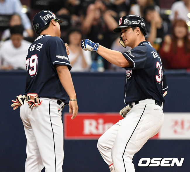김재환은 2회 무사 1S2B에서 브리검의 146km 투심을 받아쳐 우중간 담장을 넘겼다. 비거리는 125m였다. 김재환은 최근 6경기에서 무려 8개의 홈런을 때리며 가파른 상승세를 보여주고 있다. 김재환의 대포로 홈런왕 경쟁에도 불이 붙었다. / jasonseo34@osen.co.kr