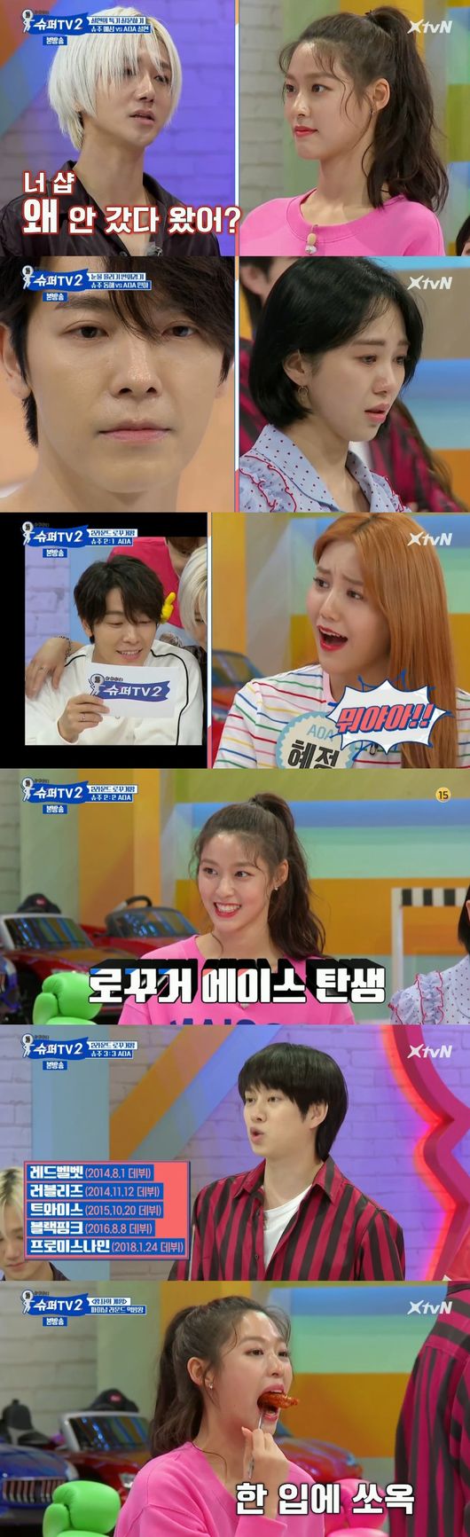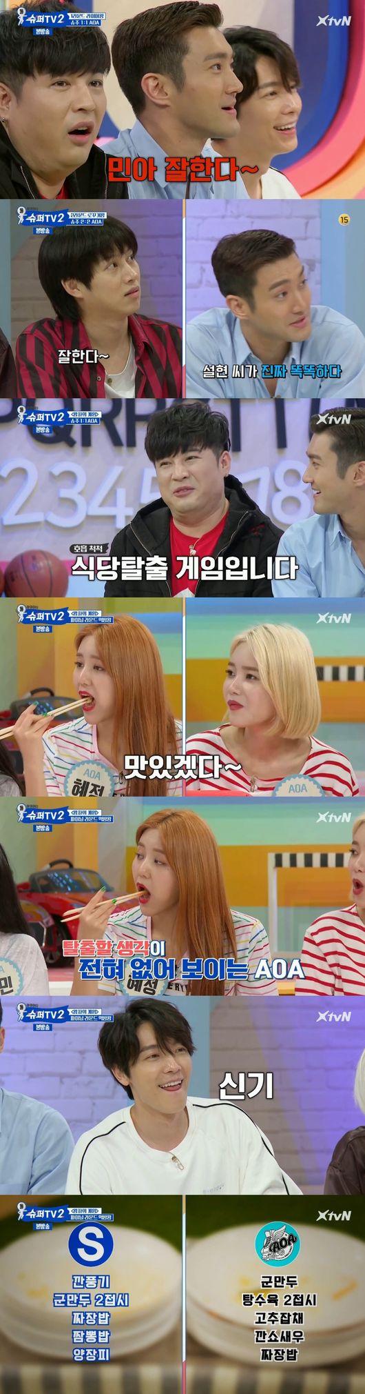 7일 첫 방송된 XtvN '슈퍼TV2'에서 슈퍼주니어는 시즌1 은혁을 빼고 시원을 투입해 6인조로 등장했다. 이들을 향해 AOA가 예능 도전장을 내밀었다. AOA는 "저희가 감히 선배님들에게 예능으로 도전장을 내밀어 보겠다. 예능왕 자리를 빙글 뱅글 돌려 보겠다"는 영상을 보냈다.