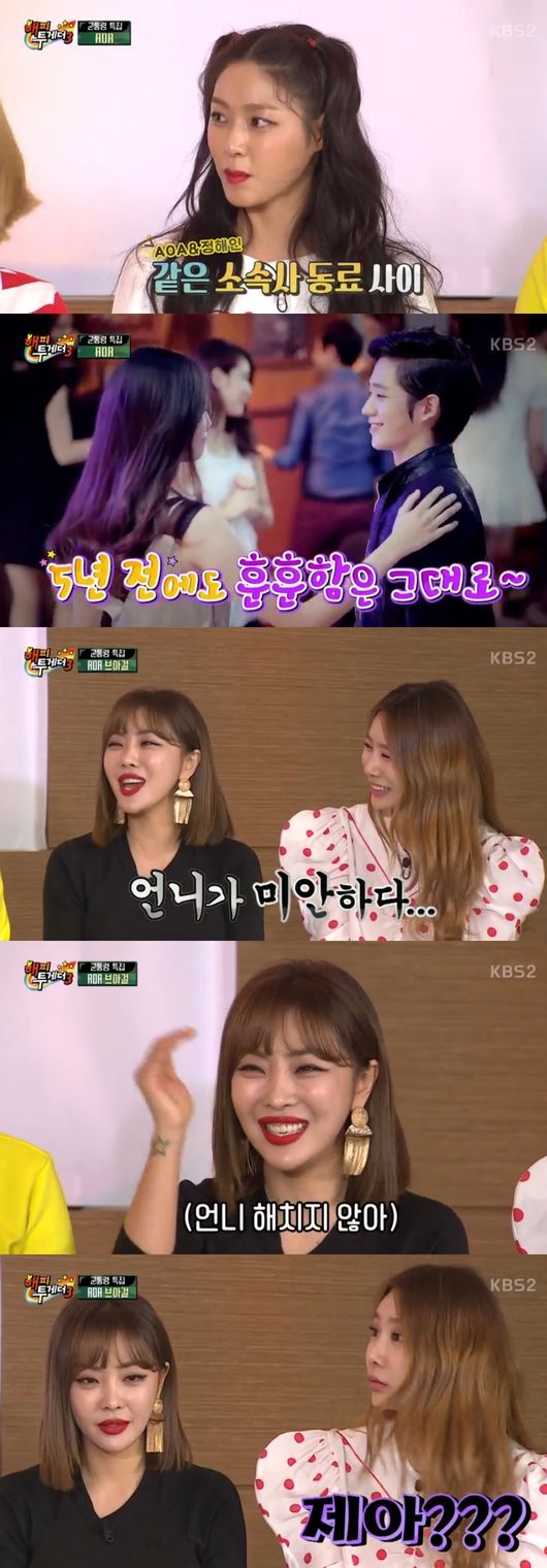 7일 방송된 KBS '해피투게더3'에는 군통령 특집으로 AOA, 브아걸, 여자친구, 하동균이 출연했다. 설현은 대세 정해인과 친분을 밝히며 "같은 소속사다. 오빠가 데뷔가 우리 뮤직비디오였다. 그래서 지금까지 연락하고 지낸다"고 말했다.