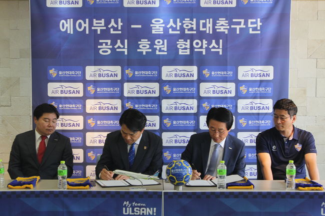 이날 오후 3시 울산현대 클럽하우스에서 열린 협약식에는 김광국 울산 단장과 한태근 에어부산 사장 등이 참석한 가운데 공식 스폰서십을 체결했다.