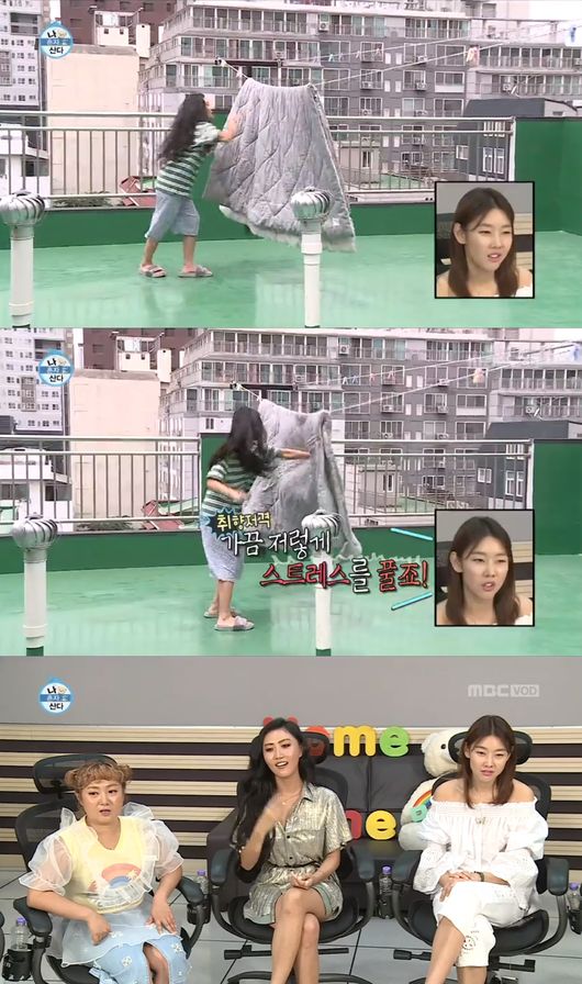 화사가 이불을 털기 위해 옥상으로 이불을 가져가서 터는 모습에서도 친근한 매력이 뿜어져 나왔다. 화사는 이불을 힘들게 옥상으로 가져가 널고는 두 팔로 이불을 털었다. 누구나 한 번쯤은 해봤을 행동이었다.