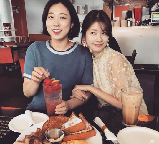 임신 7개월의 예비맘 배우 이미도가 배우 정소민과의 절친샷을 공개했다.